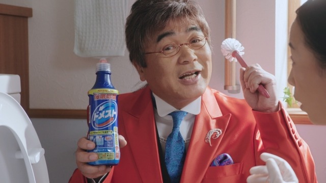CMではブラシで懸命に便器をこする奥様に、きみまろさんが「奥様、トイレ掃除まだこすってるの?」と扇子を片手に登場。その後、扇子をドメストに持ち替えて、その効果を得意の漫談口調で解説し、トイレ掃除を指南します。最後は「お掃除、簡単!」と喜ぶ奥様と共に、決め台詞で締めくくります。
