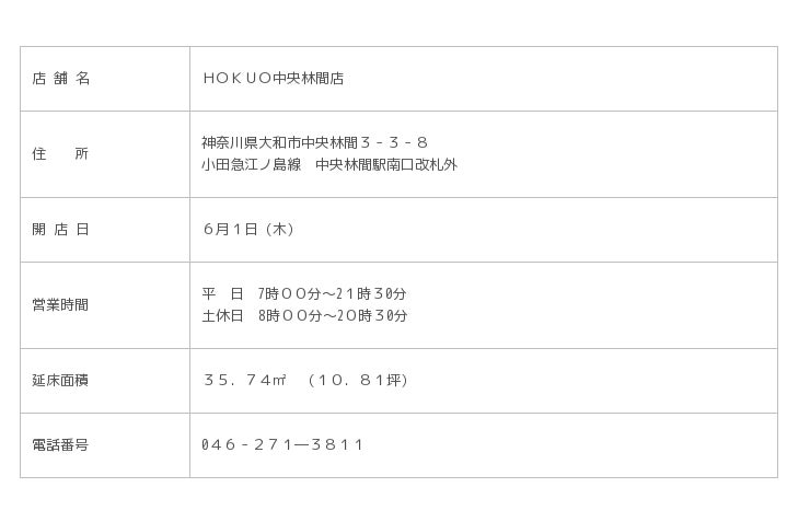 HOKUO「中央林間店」オープンの概要は以下のとおりです。