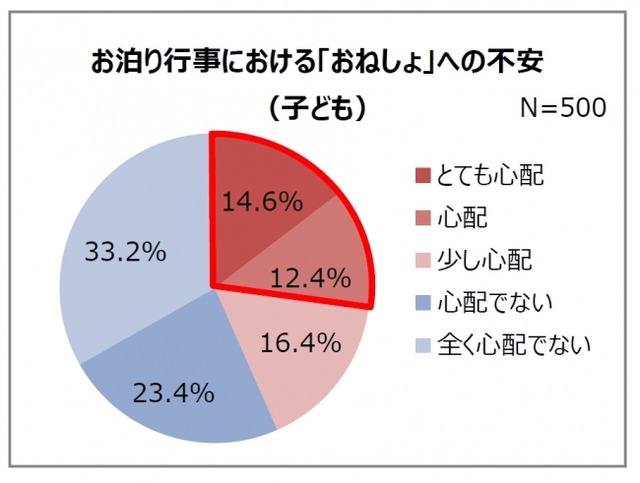 お泊り行事を前に「おねしょ」の悩みを抱える子どもたちがいます。小学校1年生~3年生の子どもとその保護者500組を対象に、夏のお泊まり行事についての不安に関する調査を実施したところ、お泊り行事のおねしょに関して「とても心配」「心配」と回答した子どもの割合が27.0%に上ることがわかりました。また、他の項目と比較すると、子どもたちのおねしょに関する心配は、「ひとりで眠れるか」、「ホームシックにならないか」に次いで3番目に多いことから、その心配の度合いが比較的高いことが確認できました。