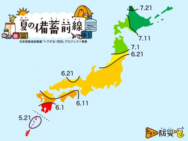 「夏の備蓄前線」は、梅雨や集中豪雨、台風などで土砂災害や洪水が起きやすいシーズンに入り、各地で雨が多くなる時期を参考に、備蓄の見直しを推奨する時期を前線図にしたものです。