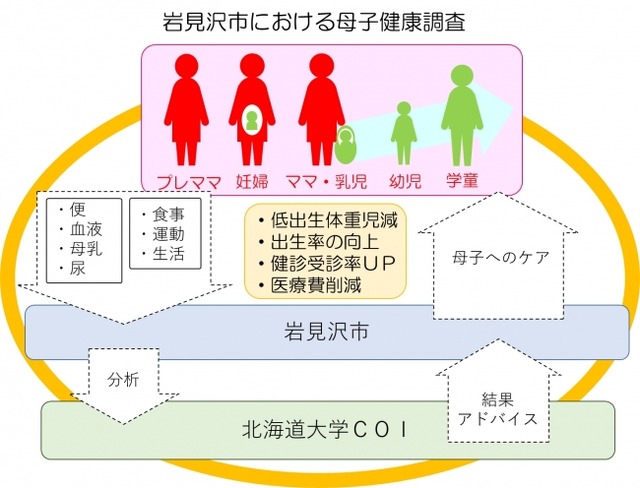 この調査では、岩見沢市で母子健康手帳交付を受ける妊婦の方々のうち、同意を得られた参加者から、妊娠中から出産後、また、生まれたお子さまにも継続的にご参加いただき、それらの測定結果は母子の健康と成長に役立てていただけるようアドバイスとともに参加者へお返しします。