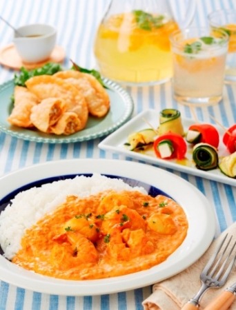 今回は夏の定番、カレーディナーのご紹介です。エビとホタテのシーフードカレーは短時間でできるのに見た目は華やか。生クリームで仕上げるまろやかな味わいでいつものカレーがちょっとリッチに。サイドディッシュの夏野菜グリルや食感を楽しめる揚げ物はカレーとの相性も抜群、ミントの香る爽やかなドリンクをプラスすればリッチなカレーディナーの完成です。この機会にちょっとリッチな欧風カレーに挑戦してみませんか。