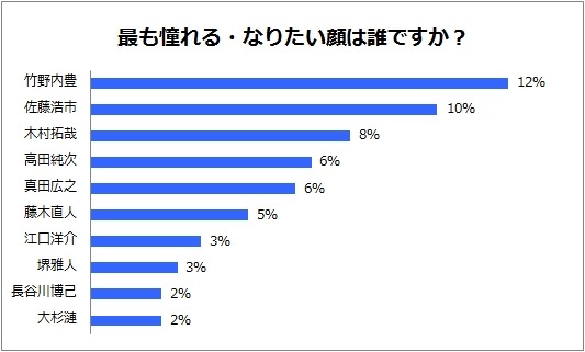 「あなたが最も憧れる・なりたい顔は誰ですか?」という質問に対して、12%の人が「竹野内豊」さんと答えました。有名ドラマや映画でも活躍している、若々しくスマートな外見が印象的な俳優さんです。
