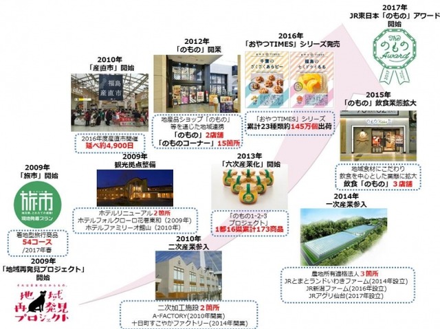 JR東日本グループでは、「グループ経営構想V~限りなき前進~」の中で「地域に生きる」を一つのコンセプトとし、「地域再発見プロジェクト」を2009年から推進し、産直市や地産品ショップ「のもの」を通じた地産品の販路拡大、一次産業参入、二次産業参入、六次産業化に向けたモノづくり等に取り組んできました。今後、地域再発見プロジェクトの一つである「のもの事業」を中心とした新たな展開として以下を取り組みます。