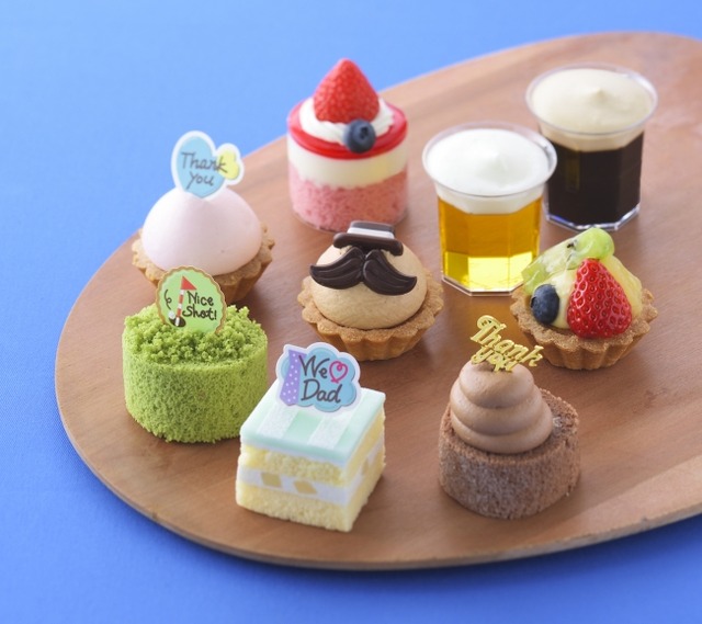 特におすすめは、お父さんのお顔をイメージしたユニークなデコレーションの新作ケーキ「サンキュー PAPA!」。ラム酒が香るチョコムースにコーヒームースを重ねたほんのりビターな味わいは、普段は辛党のお父さんにもおすすめです。また、昨年人気のプチケーキセット「父の日パーティー」もリニューアルして登場! ビールジョッキに見立てたゼリーや、ゴルフ場をイメージした抹茶ケーキ、Yシャツをモチーフにした白桃&ライチケーキなど、お父さんをテーマに、おいしさにも見た目にもこだわって仕上げました。
