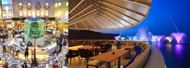 1位「別府温泉 杉乃井ホテル」の大型水槽のあるレストラン「シーダパレス」の店内(写真左)。レストラン「シーズテラス」では噴水ショーを行う(写真右)。