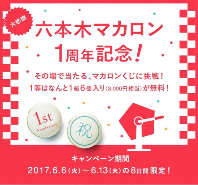 感謝の気持ちを込めて、ハズレなしのマカロンくじをご用意いたしました。六本木マカロンにご登録いただいている方ならどなたでも挑戦可能です。まだ登録していない方はこの機会に是非ご登録いただき、クーポンでお得に「六本木マカロン」をお楽しみください!