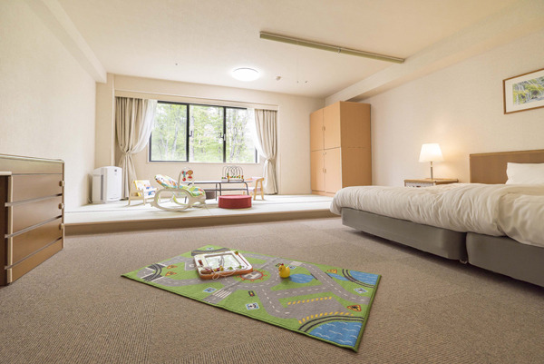 また、お子さまのおもちゃや絵本などを設置し、アメニティもお子さま連れのファミリー向けに変更しました。和洋室のゆったりスペースは、ご家族皆様がお寛ぎいただける空間をご用意しています。