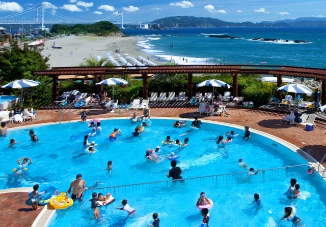 水質バツグンのプライベートビーチで海水浴、鳴門海峡と淡路島を望むアウトドアプールを宿泊者は無料でご利用いただけます。