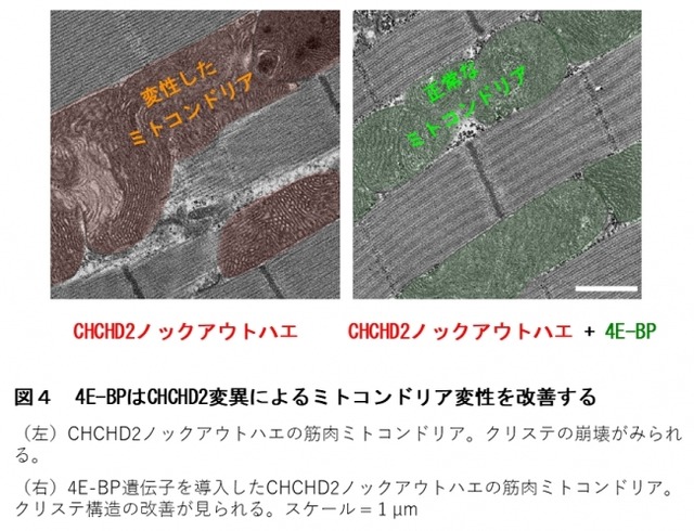 重要なことにパーキンソン病家系で見つかったアミノ酸変異を導入したCHCHD2では、 CHCHD2ノックアウトハエのミトコンドリアの不調を改善させることができませんでした。このことから、パーキンソン病はCHCHD2の機能の喪失で発症することが考えられます。次に、ミトコンドリアからのROS発生を抑える遺伝子として4E-BP*7を見出しました。 そこで、CHCHD2ノックアウトハエへ4E-BPを遺伝子導入したところ、ミトコンドリアの形態改善(図4) ・機能改善ならびにドーパミン神経変性の抑制に成功しました 。