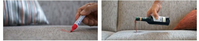 従来のソファ生地では、汚れ対策として撥水性の高い生地が一般的でしたが、高機能生地「Q2」は汚れ(水分)をはじいて汚れがつきにくくするのではなく、糸に独自の特殊加工を施すことにより、ついてしまった汚れがきれいに落とせる新素材です。ソファの代表的な汚れである、コーヒーやケチャップなどの食品系の汚れ、子どもの落書きなどによるボールペンやマジック、口紅、マニキュアなどの油性の汚れ、人やペットが座ったりすることによるシミ、色移りなど、ついてしまった汚れを中性洗剤・アセトン・漂白剤などを使用し、きれいに落とすことができます。