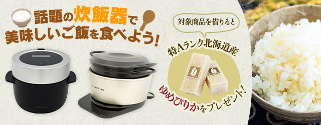 こちらの2機種を借りるともれなく特Aランクの北海道産のお米「ゆめぴりか」をプレゼントします!最高の炊飯器と最高のお米で美味しいご飯を食べよう!