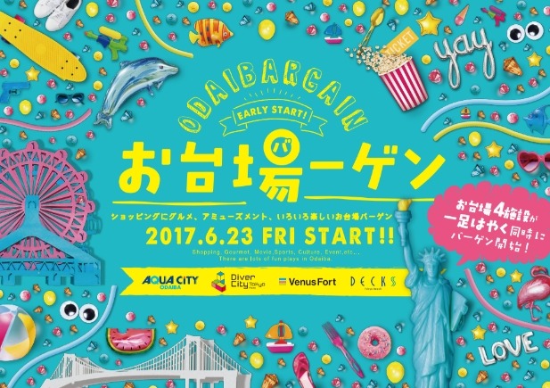 「デックス東京ビーチ」(運営:東急不動産SCマネジメント株式会社)、「アクアシティお台場」(運営:三菱地所リテールマネジメント株式会社)、「ヴィーナスフォート」(運営:森ビル株式会社)、「ダイバーシティ東京 プラザ」(運営:三井不動産商業マネジメント株式会社)の4商業施設では、夏休みに向けてお台場エリア全体を盛り上げ、活性化を図ることを目的にひと足早い合同バーゲン「お台場ーゲン」を、2017年6月23日(金)から4施設同時にスタートします。〔PDF:https://prtimes.jp/a/?f=d14324-20170609-7244.pdf〕