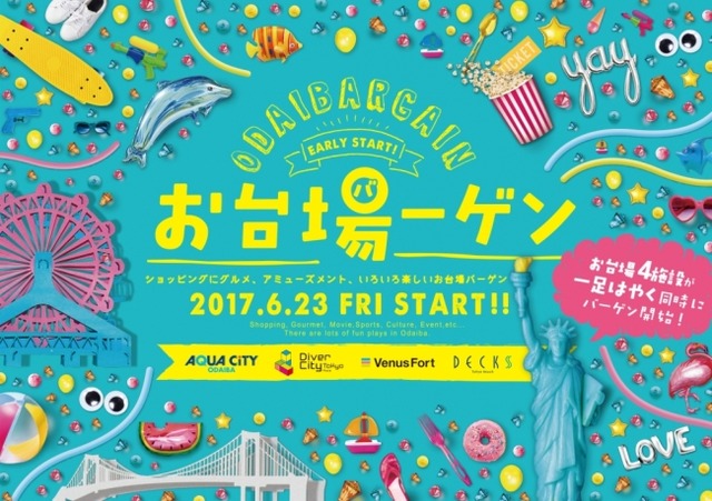 「ヴィーナスフォート」(運営:森ビル株式会社)、 「アクアシティお台場」(運営:三菱地所リテールマネジメント株式会社)、「ダイバーシティ東京 プラザ」(運営:三井不動産商業マネジメント株式会社)、 「デックス東京ビーチ」(運営:東急不動産SCマネジメント株式会社)の4商業施設では、夏休みに向けてお台場エリア全体を盛り上げ、活性化を図ることを目的にひと一足早い合同バーゲン「お台場ーゲン」を2017年6月23日(金)から4施設同時にスタートします。