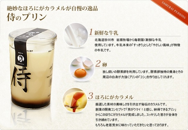 看板商品は、「侍のプリン」。秘伝のほろにがカラメルと甘さ控えめのプリンの絶妙なバランスが生み出すスッキリした味わいは、男性もとりこにする美味しさです。