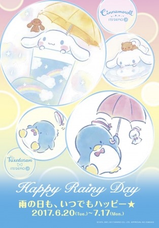 梅雨空も楽しい気持ちになる“Happy Rainy Day”をテーマにしたイラストは、シャボン玉に包まれたり、傘をさしたり、水たまりをのぞき込む2つの愛らしいキャラクターを、ブルーやピンクなど、まるで虹の様な淡いパステルカラーで仕上げた「イッツデモ」だけの書き下ろしアートで、ステーショナリー、タオル、キーホルダーなど全42種(¥170~¥3,400)を揃えます。また、店頭でお買い上げのお客様に数量限定で今回のイラストが描かれた「シナモロール」「タキシードサム」限定ショッパーをプレゼントします。