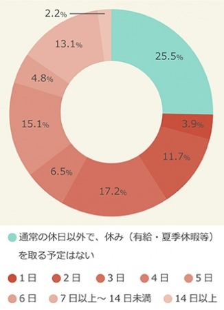 また、26%が「通常の休日以外で、休み(有給・夏季休暇等)を取る予定はない」と回答し、4人に1人は特別に休暇を取ることは予定していないことが明らかとなりました。
