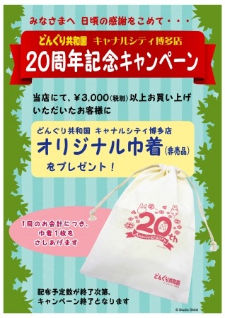 3,000 円(税別)以上お買い上げいただいたお客様に、日頃のご愛顧を込めて、マックロクロスケと20 周年ロゴがデザインされた、キャナルシティ博多店限定オリジナル巾着をプレゼントいたします。