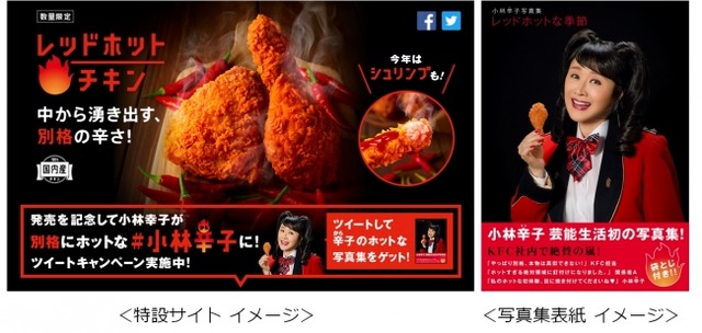 本キャンペーンでは、期間中KFC公式Twitter(@KFC_jp)をフォローして、公式Twitterまたは特設サイトから、「小林辛(から)子」に扮しホットでセクシーな「ホットパンツ辛(から)子」、ホットでキュートな「JK辛(から)子」、ホットでファニーな「トウガラシ辛(から)子」の3パターンの衣装に身を包んだ「小林辛(から)子」の中からお好きな「辛(から)子」に投票いただくと、ホットな姿がつまった “小林幸子芸能生活初”の写真集が抽選で10名さまに当たります。