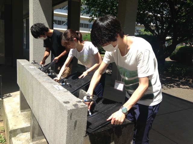 教職員に対してフィルター清掃の方法をまとめたプリントを配布し、自主的な清掃を促進しています。しかし、中には清掃する場所や時間、手間がかけられないという理由から、清掃できない研究室もあることから、3年前から環境ISO学生委員会が有料で清掃を請け負うサービスを行っています。昨年度は合計104台のエアコンを請け負いました。