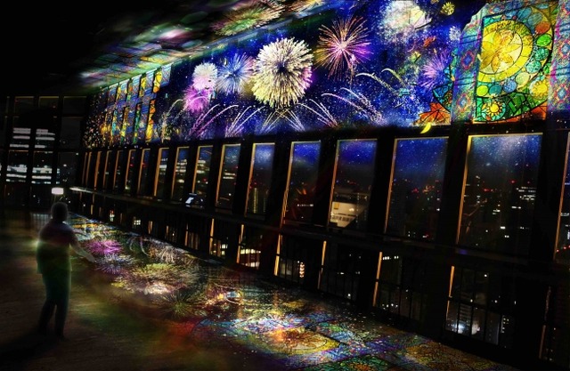東京タワーの大展望台に広がるデジタルな花火と美しい星空、 そしてきらびやかなステンドグラスのショー。