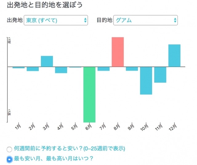 最安値で国内航空券を予約したいと思っていても、自分が予約しようとしている航空券が本当に一番安いのか疑問に思っている方も多く、このツールを使えばいつ予約をすれば一番安いのか、航空券が一番安いのは何月かが一目でわかります。