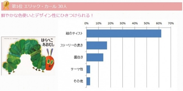 アメリカの絵本作家、エリック・カールさんが第1位になりました。「『はらぺこあおむし』が好き。自分も小さいころに好きだった絵本を、今自分の子どもに読んであげられることって、とっても素敵なことだと思うからです」(37歳女性、お子さん4ヶ月)、「『はらぺこあおむし』は、デザイン、ビジュアル、表現力、感性が刺激される」(34歳女性、妊娠7ヶ月)など、『はらぺこあおむし』の人気が高く、特に独特の「絵のテイスト」に魅力を感じている方が多いようです。