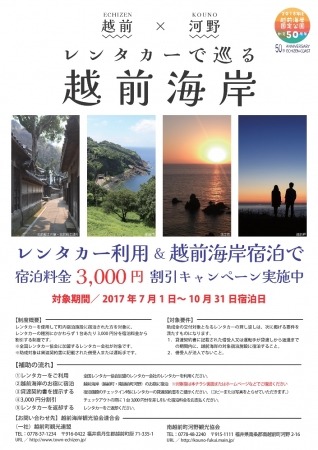 福井県越前町と南越前町河野で構成する越前海岸観光協会連合会は、2018年に国定公園制定50周年を迎えるに当たり、レンタカーを活用した周遊観光を促進するため、越前海岸観光協会連合会の加入宿泊施設に宿泊された方を対象に宿泊料金の一部を補助するキャンペーンを実施します。