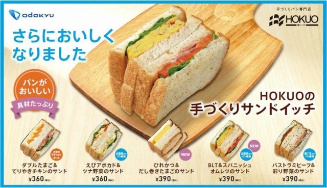 小田急グループでパンの製造・販売を行っている株式会社北欧トーキョー(本社:神奈川県座間市 社長:宇佐美 淳 店舗名:「HOKUO」)では、2017年7月6日(木)より「HOKUOの手づくりサンドイッチ」を販売します。月間4万個以上販売する「HOKUOの手づくりサンドイッチ」の具材たっぷりシリーズが今回、新商品、改良品などを加えて5商品販売致します。具材たっぷりシリーズは、どの商品も食パンの厚みより、具材のボリュームが勝る、食べ応え満点の商品となっております。パンは生地を低温でじっくりと熟成させ、小麦本来の風味を引き出した“北欧の食パン“を使用しています。口どけが良いので、たっぷり挟んだ具材との相性も抜群!ヘルシーな全粒粉や黒ごまを使った商品も取り揃え、パンもお楽しみいただけます。