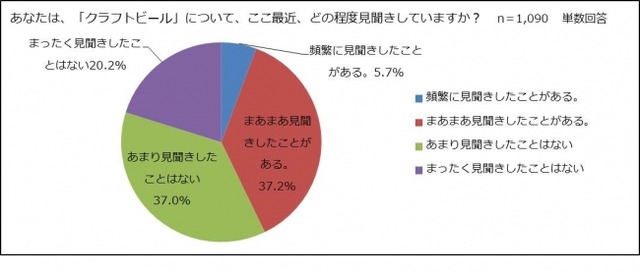クラフトビールを1994年以降に設立された小規模なビール会社が製造販売するビールと示し、回答者全員に見聞きしたことがあるかを聞いた。「頻繁に見聞きしたことがある」人が5.7%、「まあまあ見聞きしたことがある」人を含めると42.9%と4割を超える人がクラフトビールを認知していることが分かった。