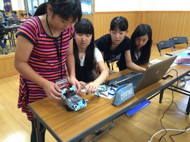 子どもたちは、チームでロボットをプログラミングして、実際に動かし、最後はその成果を全員の前で発表します。