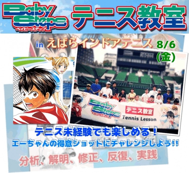 □ タイトル 「えばらインドアテニスで開催決定「ベイビーステップ テニス教室」。少年マガジンで大人気連載中の本格派テニス漫画の世界を楽しく体験。あつまれスポーツ大好き小学生!8/6(日)」