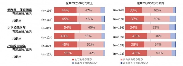 肯定的な回答をした人は回答者の属性や子どもの年齢を問わず約90%を占めました。しかし、その内訳を見ると「とてもそう思う」は世帯年収で異なり、世帯年収800万円以上では約半数の46.6%、800万円未満では36.4%と、約10ポイントの差が出ています。