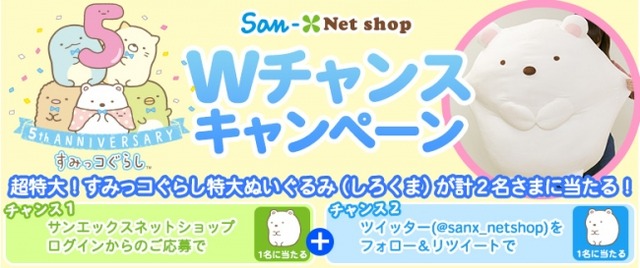 2017年8月24日(木)18:00までの期間中に、無料会員ログイン、Twitterよりご応募ください。ご応募いただいた方の中から、計2名さまに『すみっコぐらし特大ぬいぐるみ(しろくま)』をプレゼントいたします。