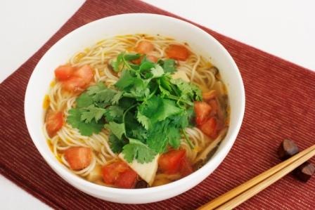 4...器にそうめんを盛り、(3)を注ぎ、コリアンダーと2cm角に切ったトマトをトッピングする。