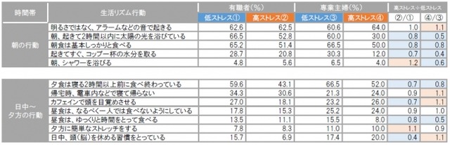 「起きて2時間以内に太陽の光を浴びる」「朝食はしっかり食べる・起きてすぐコップ一杯の水分を摂る(胃腸の活性)」と、ストレスオフに有効な物質であるセロトニンや自律神経の活性に繋がる行動を積極的に行っている、有職者・専業主婦の低ストレス女性。「朝、シャワーを浴びる」は、専業主婦では低ストレス者の行動であったことから“朝シャワー=時間を贅沢に使えている”、有職者では高ストレス者の行動であったため“朝シャワー=出勤のためにすべきこと”と、捉え方の違いが推測されます。