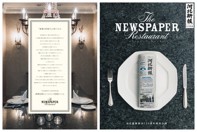 河北新報社(本社:宮城県仙台市青葉区五橋一丁目2-28)は、創刊120周年を記念して、7月21日に特別企画「ニュースペーパーレストラン」(別刷全16頁)を発行しました。「地元から、日本中から、世界中から旬の情報を目利きし、編集したものを、温かいうちに毎日届ける」ことを続けてきた河北新報にとって「記者は料理人であり、新聞は料理だと例えられるかもしれない」。たくさんの情報が溢れ、一つ一つの情報について深く考えることが難しい時代に、情報を深く味わうことの大切さについて考えたい。そんな、新聞メディアとしての思いが込められた企画です。