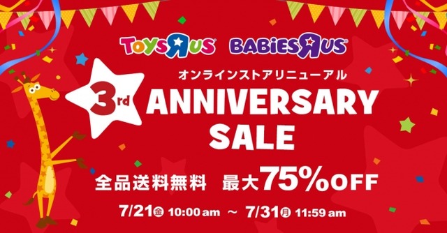 玩具とベビー用品の国内最大級の総合専門店である日本トイザらス株式会社(本社:神奈川県川崎市、以下、日本トイザらス)は、2014年7月に実施した公式ネット通販サイト「トイザらス・ベビーザらス オンラインストア」(http://www.toysrus.co.jp)のリニューアルオープンより3周年を迎えます。これを記念して、今年は例年よりセール期間を7日間延長し、7月21日(金)午前10時から7月31日(月)午前11時59分までの10日間と2時間にわたり、同サイト限定でアニバーサリーセールを開催いたします。