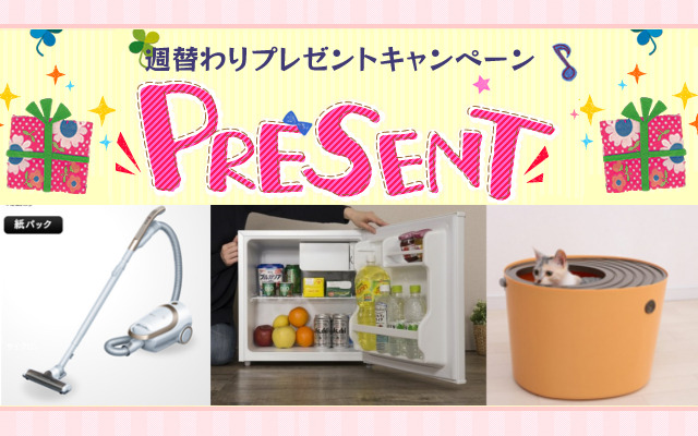 今週は、CM放映中の 「軽量紙パッククリーナー」を1名様 、一人暮らしにぴったり「1ドア冷蔵庫」を1名様 、 小柄な猫ちゃん用「上から猫トイレプチ」を5名様、 合計7名様 にどど~んとプレゼントいたします!