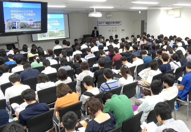関西大学、関西学院大学、同志社大学、立命館大学、京都産業大学、近畿大学、甲南大学、龍谷大学、この8大学が一堂に集まるイベントは関西で唯一ということもあり、去年にも増して多くの生徒、保護者、高校の教師•進路指導担当者が参加。事前予約の数も、昨年の約26パーセント増。会場の増設、中継システムの設置などの対応に追われましたが無事開催に至りました。