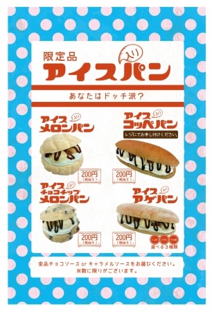 販売価格はそれぞれ200円(税抜き)。該当のパンを販売棚よりお持ちいただき、レジにて「アイス入りパン」とご注文ください。アイスクリーム、ホイップクリーム、ソースはレジにてお入れしています。