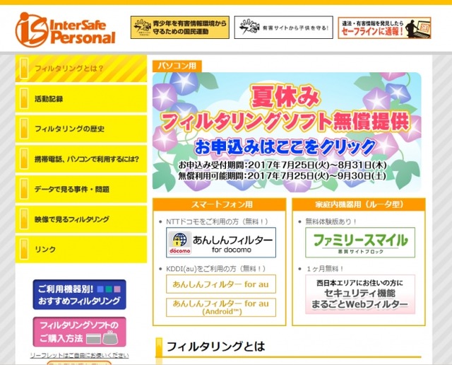 そこでALSIは、2017年7月25日より家庭のパソコン用フィルタリングソフトを無償で提供いたします。この取り組みは、2004年から開始し、今年で14回目の実施となります。申し込みは、専用サイトにて受付をいたします。 (利用可能期間:7月25日~9月30日)
