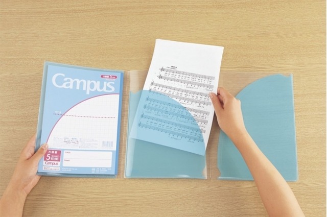 「キャンパス プリント整とんカバーノート(用途別)」は、セミB5サイズのノートを1冊セットできるカバーにプリントを収容できるポケットが2つ付いた、プリントとノートを一緒に管理できる商品です。配布されたプリントを教科別・目的別に分類でき、プリントを紛失しにくくします。また、ポケットがプリントの端の折れや汚れを防ぐので、きれいに管理することができます。