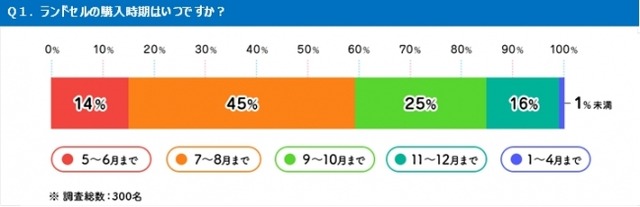 7月・8月に購入された方が45%と、最も多い結果になりました。加えて注目すべき点は、小学校に入学する1年前の4月から8月までに購入を済ませている方が、約6割(59%)も占めていることです。「夏休み中までの購入」が1つの基準になっているようです。