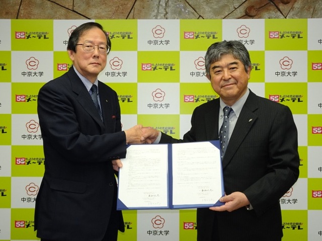 7月27日(木)午後1時より、中京大学名古屋キャンパス(名古屋市昭和区)にてインターンシップについての締結式を行い、メ~テレ代表取締役社長・横井正彦(よこいまさひこ)と、中京大学・安村仁志(やすむらひとし)学長が覚書を交わしました。