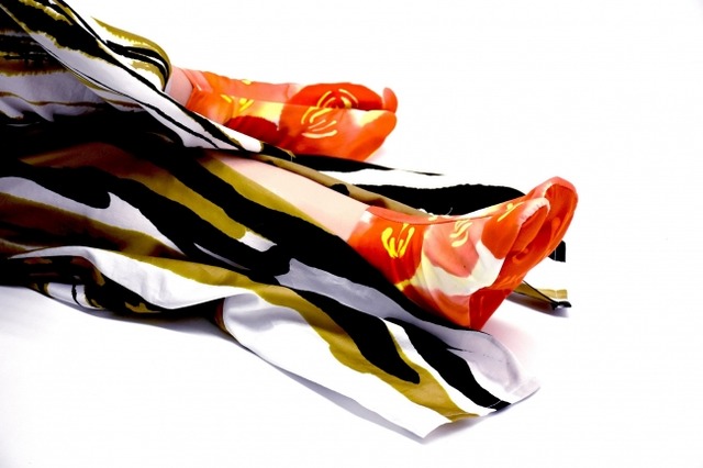 色柄足袋を作るという課題だったので、"派手な伊達者のための足袋"というコンセプトのもと、足袋、クッションカバーとボトムス、トップスを制作した。