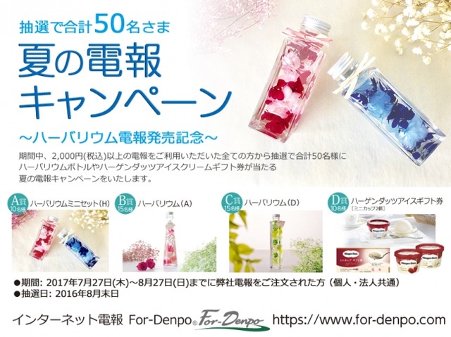 インターネット電報サービスのFor-Denpo(URL : https://www.for-denpo.com)を提供する株式会社プライムステージ(所在地:広島県広島市、代表取締役:北谷 宏朗)で、2017年7月27日~8月27日までの期間中、2,000円(税込)以上の電報をご利用いただいたお客様の中から抽選で50名様にハーバリウムボトルやハーゲンダッツアイスクリームギフト券が当たる夏の電報キャンペーンをいたします。