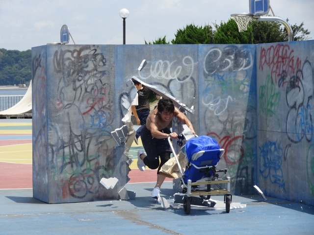 このベビーカー編では、LMWテクノロジー搭載のLMWベビーカーと非搭載のNO LMWベビーカーを使って、傾斜や段差の多いスケートボード場のコースを激走し、LMWテクノロジーの有無による違いを表現しました。