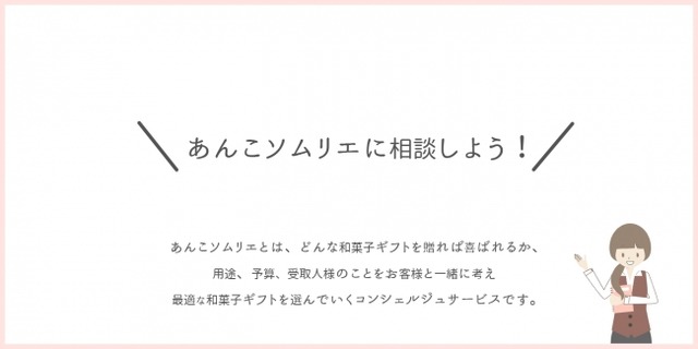この度、サービス開始致しました「あんこソムリエ」とは、どんな和菓子ギフトを贈れば受取人様に喜ばれるか、用途、ご予算、受取人様の年齢や性別、お味の好み、ご関係などをあんこ百貨店スタッフがお聞きして、最適な和菓子の贈り物をお客様と一緒に選んでいくEメール相談型のコンシェルジュサービスです。