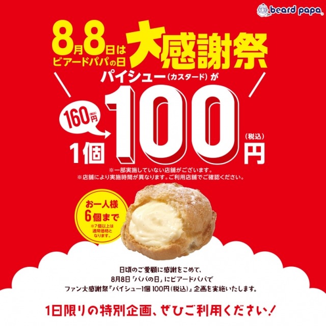 日頃のご愛顧に感謝をこめて、8月8日(パパの日)にビアードパパにて『パイシュー』を1個160円→特別価格100円(税込)で販売するイベントを実施いたします。1日限りの特別企画、ぜひご利用ください!